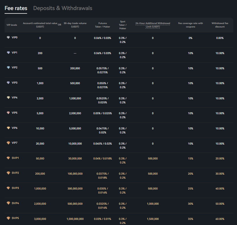 BTCC offers a highly competitive fee structure that is particularly appealing to futures traders. For spot trading, maker fees are set at 0.2%, while taker fees are 0.3%. However, it is in futures trading that the platform truly distinguishes itself, with maker fees dropping to just 0.025% and taker fees to 0.045%.